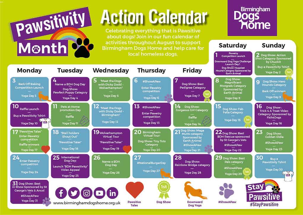 Birmingham Dogs Home’s ‘Pawsitivity’ campaign launches on 1st August. Dog lovers everywhere are encouraged to join in the fun and share their support for BDH by enjoying the planned daily fun across via the charity’s social media platforms and by sharing happy, positive “selfies” of themselves with their dogs, showing a paw of support using the hashtag #ShowAPaw throughout August.