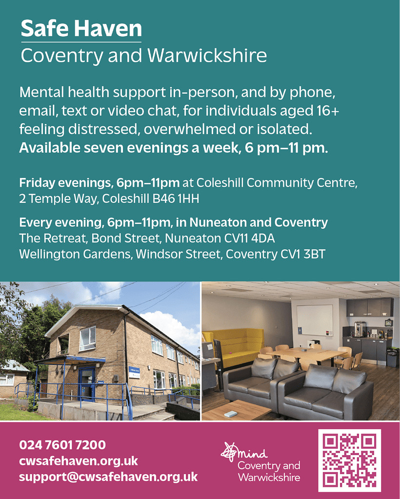 The Safe Haven Coventry and Warwickshire service also runs seven-day-a-week drop-ins in Coventry (Wellington Gardens, Windsor Street) and in Nuneaton (The Retreat, Bond Street).  By the end of November further Safe Havens will be open in Rugby, Stratford-upon-Avon and Warwick. You can access any of the Safe Havens by attending any of the venues or by phone, email, text or arranging a video chat.